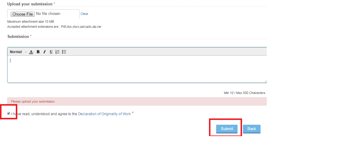 Step 6: Select the check box “Declaration of original work” and click on submit button to submit your project synopsis document.